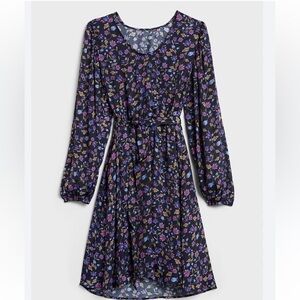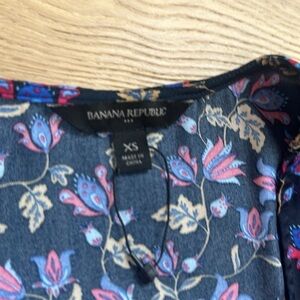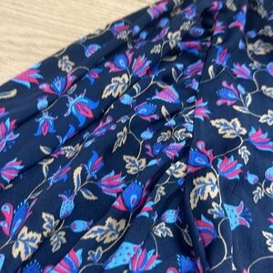This beautiful Banana Republic dress features a navy blue and pink floral pattern, long balloon sleeves, and a scoop neckline. The pullover dress has a tie waist sash accent and falls at knee length. It is made of 100% polyester and is perfect for travel, casual outings, workwear, and business settings.
