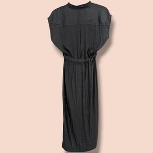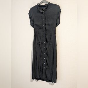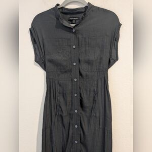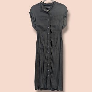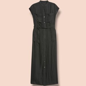 Banana Republic Petite Grey Silky Short Sleeve Button-Up Belted Flowy Maxi Shirt Dress Classic Minimalist.