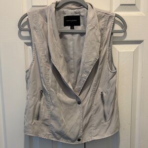 Chic and versatile Banana Republic sleeveless moto-style vest in a soft neutral beige/gray tone. Features an asymmetrical front zip with snap closures, two functional zippered pockets, and a modern tailored fit. Lightweight and perfect for layering.