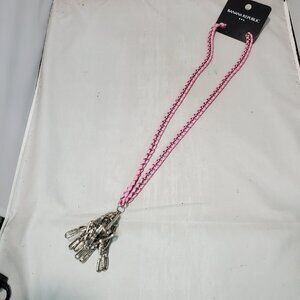 Banana Republic necklace features a unique combination of pink fabric, silver-toned chain, and a substantial, multi-strand silver-toned tassel pendant. It offers a modern and eye-catching design with textural contrast.