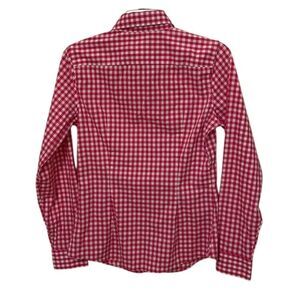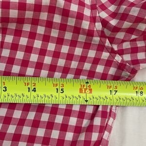 Lipstick pink and white, gingham, 95% cotton, 5% spandex, non-iron, fitted, button up, long sleeve collared shirt by Banana Republic in a women's size 6. Machine washable. Approximate measurements shown in photos. In great pre-owned condition with little to no signs of wear.
