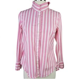 Chic button-up with pink and white stripes. Ideal for versatile styling.