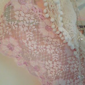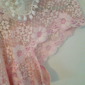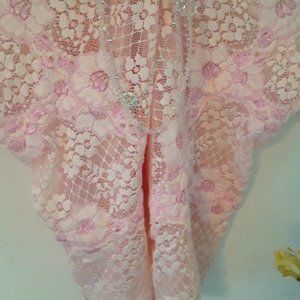Pretty soft pink Banana Republic lace blouse with a floral pattern throughout. Sz.. L and has not been worn. V-neck & scalloped trim. Flawless condition. Can be worn as is or great layering piece. Lots of stretch to the fabric, Laying flat from under arm to under arm it measures 19." The length is 24." From a pet & smoke free home.