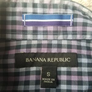 Excellent pre-owned condition long sleeve button up shirt, Banana Republic, Slim Fit, color plaid blue/purple, men's size Small.
