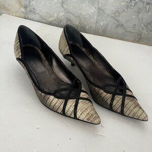 These Banana Republic pointed snake-like kitten heels are a stylish and sleek choice for women looking to make a statement. The black and cheetah color combination adds a trendy touch, while the leather material provides durability and quality. With a pointed toe and stiletto design, these heels are sure to elevate any outfit and provide a comfortable fit for a night out or special occasion. The kitten heel design offers a touch of glamour without sacrificing comfort, making them a versatile and fashionable option for any wardrobe.
