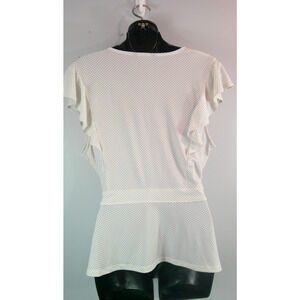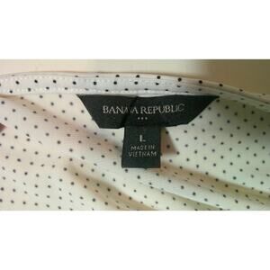 The Banana Republic Polka Dot Blouse is a stylish and versatile top for women in size Large. This flutter sleeve top features a tie waist design, a v-neckline, and a bow accent, making it a chic choice for any outfit. Made of lightweight and breathable polyester material, this blouse is perfect for casual or dressier occasions. The classic polka dot pattern in white adds a playful touch to the overall look, while the regular fit ensures comfort and ease of movement. Perfect for those who appreciate quality and style in their wardrobe.