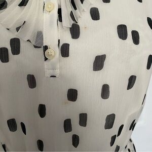 Chic sleeveless dress with black polka dots. Features a pleated skirt and a stylish tie neckline.