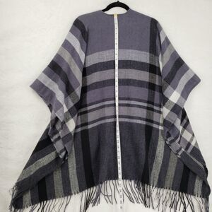 Classic open-front, open side, shawl style poncho kimono wrap with purple-ish blue, gray, white, and black plaid pattern and fringe hem.