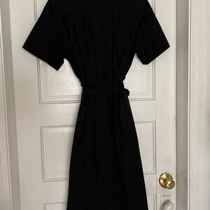 Black poplin shirt dress with button closure, waist tie, and collar.