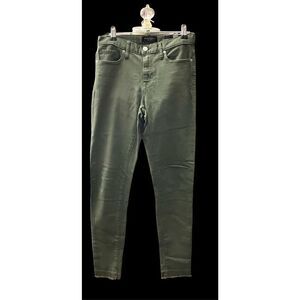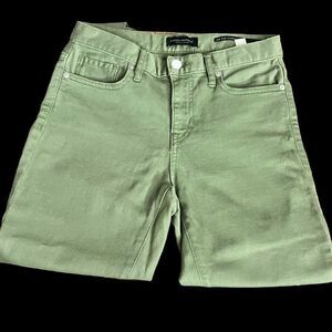 Green denim in EUC. The distressing at the hem has been hemmed before. Really no negatives to point to. As far as sizing goes, the tag says “25”, but the measurements show a bit bigger. Please see pic. The inseam is 29”.