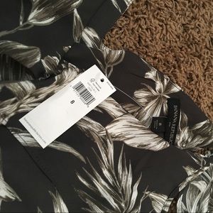 Super cute and light. 100% polyester. Can be machine washed. Imported. Made exclusively for Factory stores. V-neck. Hook closure at v-neck. Spaghetti straps. Hidden center front hook closure. Elasticized waistband. Fully lined. Never been worn with tags attached. Comes from a pet/smoke free home.