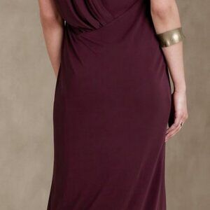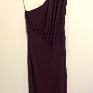 Elegant and timeless, this one-shoulder Banana Republic evening gown features a draped bodice and a flattering silhouette with a side slit for subtle movement. The soft stretch jersey fabric ensures comfort while maintaining a sophisticated, flowy look — perfect for weddings, formal events, or evening parties.