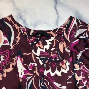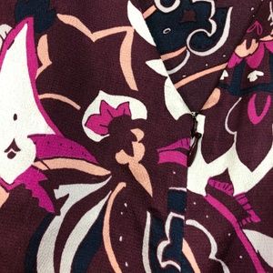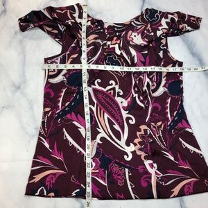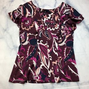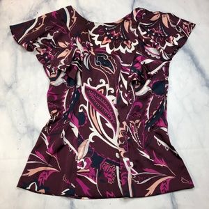 Bright and fun Banana Republic blouse! Gorgeous aubergine purple color with a bright paisley design throughout, with a high scoop neck and v back cut. Flutter sleeves draped across the shoulders and back zipper closure. Missing materials tag. In good condition!