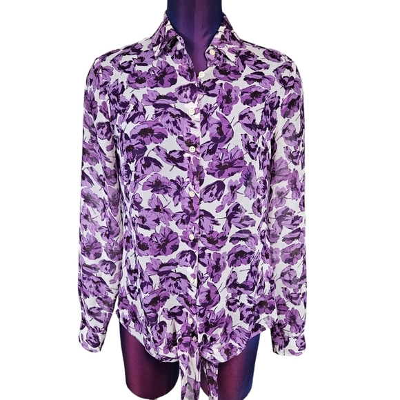 Banana Republic Purple & White Floral Semi Sheer Button Front Top Size 2 S36