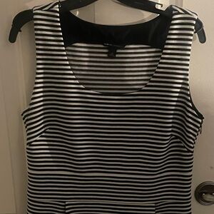 Chic sleeveless dress featuring classic black and white stripes. Scooped-neck, side zipper with 2 front pleats. Professional elegance at its finest! Perfect for the office, or cocktails.