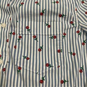 This is a ladies Banana Republic button down blouse in the Quinn Boy Fit style. It is a blue and white striped print with red roses on it. There is a front pocket on one side and there are buttons at the wrist. The shirt is a cotton and polyester blend and is a size medium.