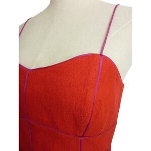 Spaghetti strap red dress. Fabric is textured, reminds me a bit of a tennis ball fuzziness. Great preowned condition. Contrast piping outline gives it a corset look at bust.
