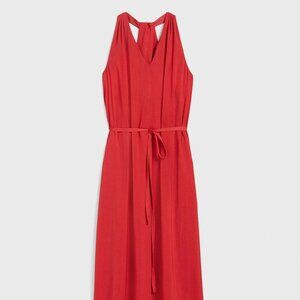 Chic red maxi dress with a sleeveless design. Has pockets. Twist Back Halter.