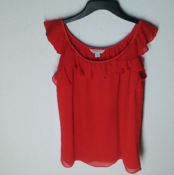 The top is a beautiful bright red made out of a light fabric that falls beautifully on the body. There is ruffled detailing around the neck.