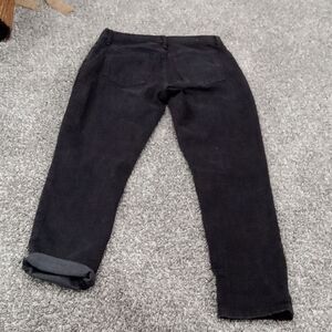 Ankle length uncuffed cropped length cuffed. Zip button closure with belt loops. Low rise with a tapered leg and 5 pockets. 90% cotton 9% poly 1% elastane. style 515322