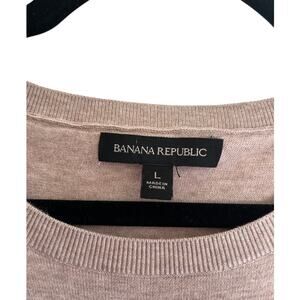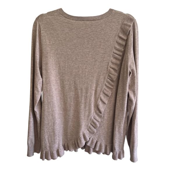 Lovely, comfy, and cozy long sleeve ruffled tulip back sweater from Banana Republic. Women's size large. The crew neck, pullover sweater features a ruffled hem and ribbed cuffs and is perfect for fall. Made from viscose and polyester blend, the taupe beige knit weave has stretch but retains its shape well. Perfect for preppy, classic, office, and weekender styling. Excellent pre-owned condition.