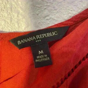 Stylish Banana Republic tank top in a vibrant rust orange shade, perfect for adding a pop of color to your wardrobe. Features beautiful embroidered details on the front for a unique touch. Adjustable spaghetti straps provide a customizable fit, making it versatile for layering or wearing on its own. Made of 100% rayon, this top offers a lightweight and comfortable feel.