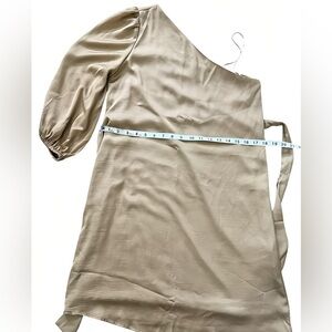 Gorgeous and sleek one-sleeve satin dress by Banana Republic in a stunning Champagne Toast color. This piece features a tie waist for a flattering fit and elegant midi length. It’s the perfect mix of classy and modern – ideal for weddings, parties, or any special occasion.