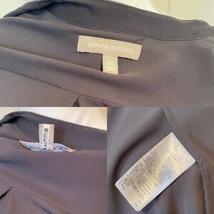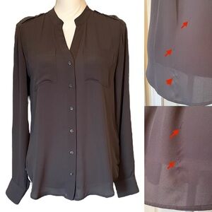 Pre-owned Banana Republic Sheer Gray Long Sleeve Button Up Blouse. Women’s size XS, 100% polyester, no stretch. See through, sheer and lightweight. Long cuffed sleeves, front pockets and buttons down front side. Some pulls and thread runs on backside. See all photos.