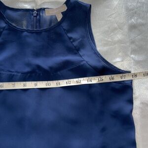 Banana Republic Sheet Inset Tank Navy Blue. Piped crew neck. Sleeveless. Sheer insets at front and back. Covered back zipper. Slightly High/low rounded hem. sleeveless, navy blue blouse with a sheer inset at the upper chest. Satin trim. Approximate measurements in photos. Excellent condition.