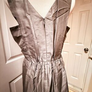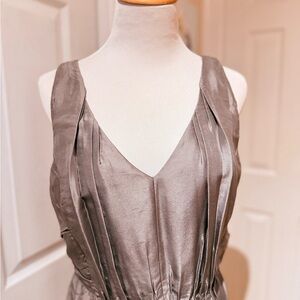Chic silk gray mini dress with a sleeveless design. Side zipper. Can be worn with a nice belt. Fully lined. Perfect for stylish outings.