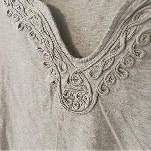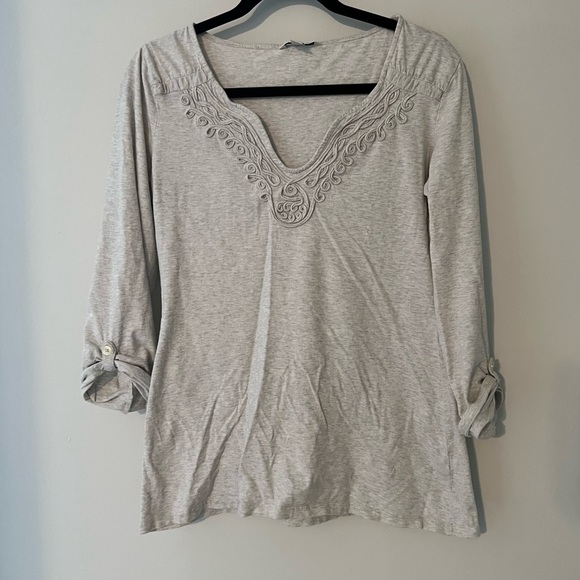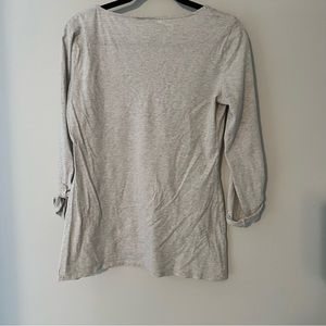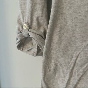 Very light grey. Comfortable fabric. Beautiful detailed neckline. 3/4 length sleeves with button detail.