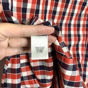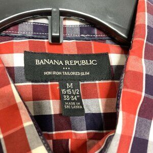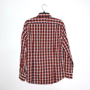 Non Iron Tailored Slim Shirt. Red, White and Navy Plaid. Button Front. Chest Pocket. Long Sleeve. Collared.