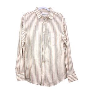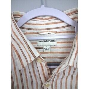 Banana Republic Mens 100% Linen Shirt Large Beige Brown Orange Stripes Button Up Coastal Resort.