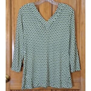 This shirt from Banana Republic is in excellent preowned condition - No flaws. Green and Cream Retro Diamond Pattern. 100% Lyocell. Jersey Fabric. 3/4 Sleeves. V-Neck. Empire Waist. Size Medium.