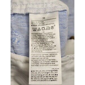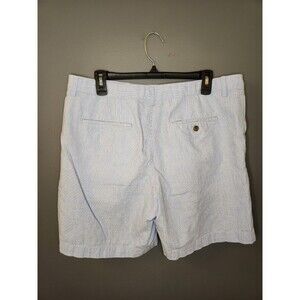 These Banana Republic men's shorts in size 35 feature a classic blue striped linen blend, making them perfect for casual occasions with a preppy touch. The 7" inseam and regular fit offer comfort and style, while the chino style and flat front add a polished look. Easy to care for with machine washable material, these shorts also feature slash pockets for added functionality. Perfect for the beach or everyday wear, these breathable shorts are a versatile addition to any man's wardrobe.