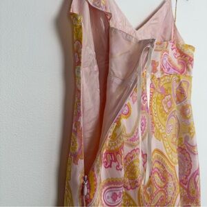 This is a Banana Republic silk dress in size 2 petites, featuring a pink paisley pattern with a babydoll silhouette and ruffle accents. The sleeveless dress has a V-neckline, strappy sleeves, and a zip closure. It is lined, lightweight, and perfect for occasions like weddings, parties, or cocktails. The style is reminiscent of Y2K fashion with elements of a soft girl, coquette, and fairy aesthetic for a charming and flirty look.