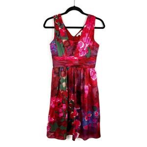 Banana Republic Silk Dress Sleeveless V Neck Fit Flare Watercolor Red Pink Sz 2