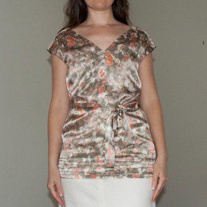 Look sophisticated and polished with minimal effort in this lovely satin Banana Republic top. Throw this on over stretch pants for an easy and comfortable outfit. This top features a flattering belt and lots of lovely details, like pleating along the shoulders and hem and a painterly floral print. Gorgeous shades of sage green, pink and orange really pop with coral accessories. In excellent condition, with slight pulling at the back seam (see second to last photo). Perfect for work, church, or weekends out with friends. 100% silk