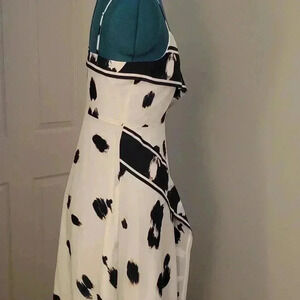 Paintstroke high low dress. navy and tan on white polyblend. High low handkerchief style skirt with crossover top and adjustable straps. Perfect for date night or a spring party. Excellent used condition. Smoke free home.