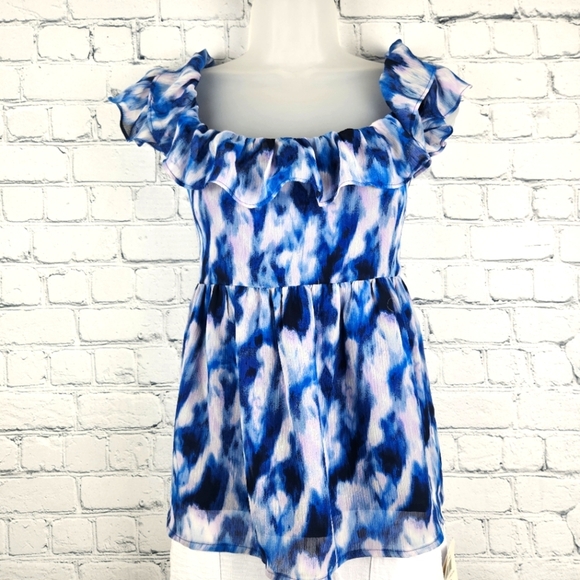 Stylish ruffle top with a blue pattern and tie back. Perfect for casual outings.