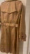 Belted tan, double breasted with details on shoulders, sleeves, collar, neck closures, buttoned pockets, back flap, world map lining, and back slit. Worn once and in excellent condition.