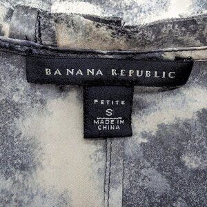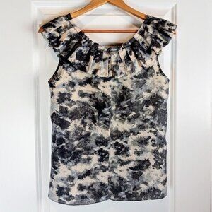 Pure silk sleeveless top with pleat neck ruffle from Banana Republic in slate blue and grey abstract print.