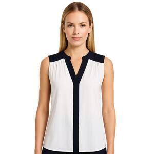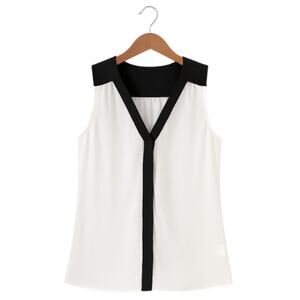 Keywords: Banana Republic top, white blouse with black trim, workwear sleeveless blouse, contrast trim blouse, minimalist office top, women’s size 2 blouse