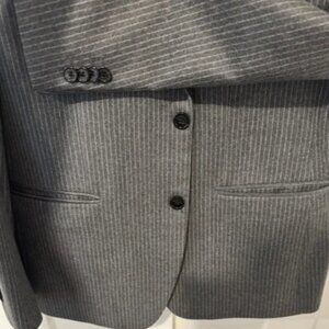 Sophisticated charcoal two button Italian wool pinstripe slim fit suit. Ideal for business or formal events. Woven by masters of textile innovation at Italy's Marzotto mill, this suits exquisite craftsmanship is sure to impress. Single vented jacket. Pants are 33”x30”.