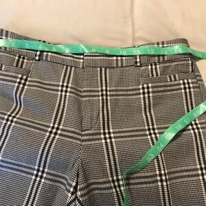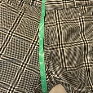 The Banana Republic Sloan Pants in Women's size 6 feature a houndstooth plaid design, made from a blend of rayon, viscose, spandex, and cotton. These crop pants have a low rise and a tapered leg style, perfect for a casual or business occasion. With a zip and hook & loop closure, these lightweight and comfortable pants are machine washable and easy to care for. The stylish and versatile design makes them a great addition to any woman's wardrobe, ideal for the winter, fall, or spring seasons. Smoke and sept free home. Measurements in photo.