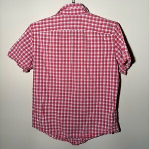 This Banana Republic short sleeve button-down shirt is a perfect blend of style and comfort. Featuring a classic red and white plaid design, this soft wash shirt is crafted from 100% cotton, making it lightweight and breathable. Ideal for casual outings or layering under a jacket for a more polished look.