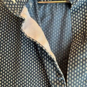 Banana Republic tailored slim fit shirt in a medium blue with a navy-and-white geometric pattern. Made from 100% cotton and soft-washed for a comfortable, lived-in feel.