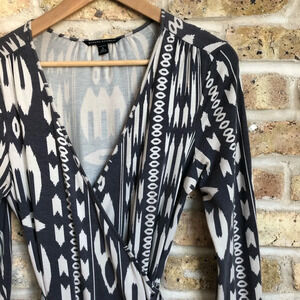 ✨ Southwest pattern wrap dress, crazy comfy and has a ton of stretch! (50% rayon, 26% tencel, 19% cotton, and 5% spandex) The grey and cream color is perfect for any season, and can be paired with flat sandals or with tights and boots.