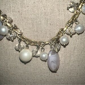 The Banana Republic Statement Necklace features a chunky teardrop tone chain bib with an oval pendant in a gold color. This statement necklace is signed by the brand and has a length of 19 inches, making it a bold accessory for any outfit. Perfect for adding a touch of glamour with its white main stone and chunky design, this necklace is a stylish choice for those looking to make a statement with their jewelry.