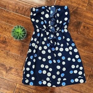 In great condition ~Front Ruffles ~Perfect for spring/date nights ~Navy Blue base color -Mini Dress -Strapless
